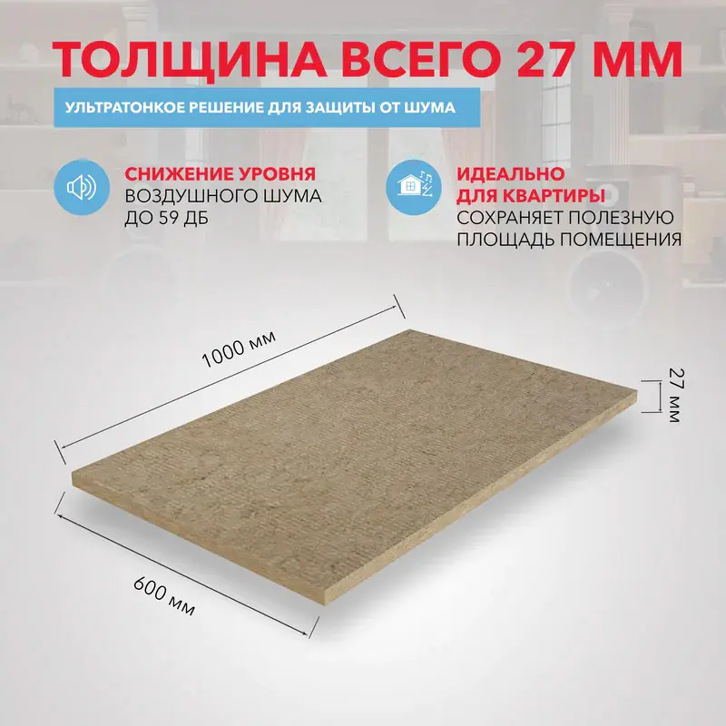 - Сохраняет полезную площадь. Самое тонкое акустическое решение из каменной ваты – толщина всего 27 мм.