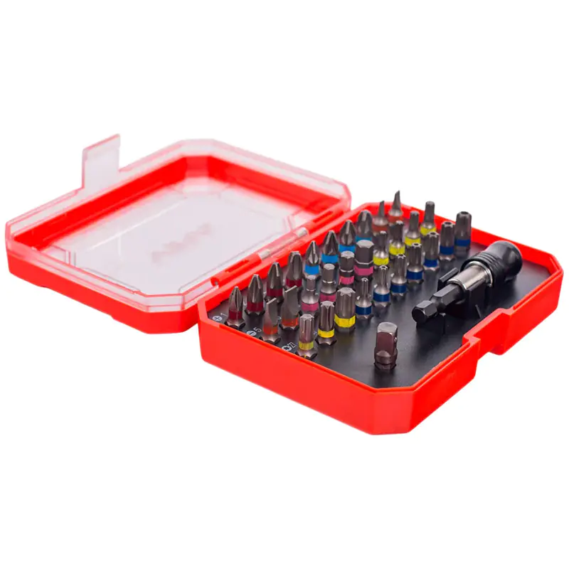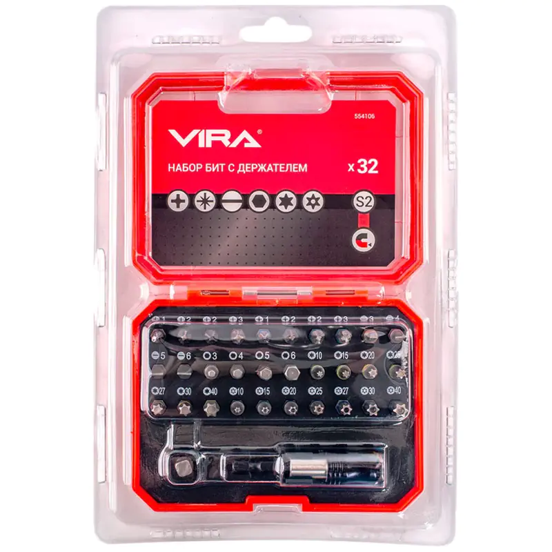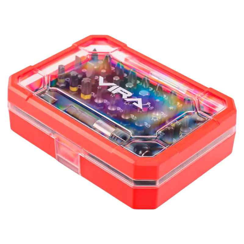 В состав набора VIRA входит 30 бит различных типоразмеров, магнитный держатель для бит с хвостовиком 1/4“Male HEX и адаптер на 1/4“Male DR. Набор предназначен для монтажа/демонтажа крепежных элементов, имеющих различные виды шлицев. Длина бит 25 мм.