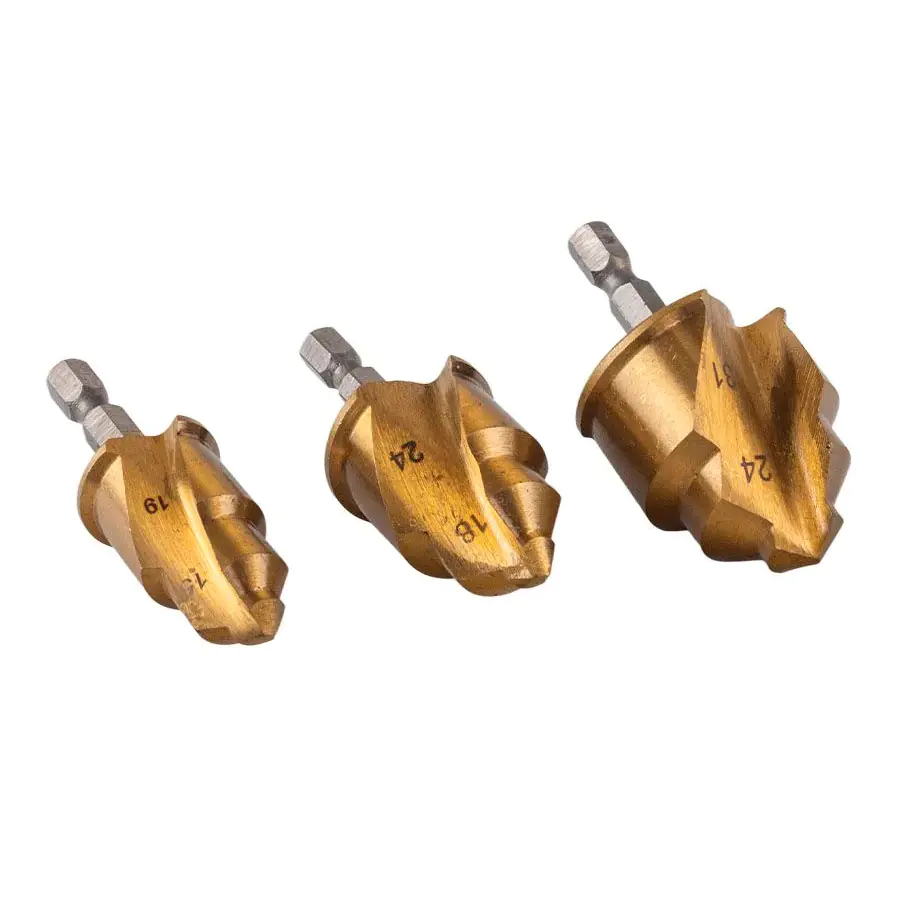 Набор ступенчатых спиральных сверл для полипропиленовых труб 15-19, 18-24, 24-31 мм предназначен для расширения фитингов водопроводных пластиковых труб. Сверло позволяет расширять отверстия ранее уже спаянных фитингов до необходимых размеров для повторной пайки труб. Конструкция сверла обеспечивает оптимальный отвод стружки из зоны сверления. Специальная спиральная канавка служит для увеличения плавности и скорости работы по сравнению с обычным ступенчатым сверлом. Изготовлены из высококачественной стали, что повышает долговечность и износостойкость инструмента. Шестигранный хвостовик 1/4'' НЕХ позволяет устанавливать сверла как в зажимной патрон электроинструмента, так и в патрон типа HEX.