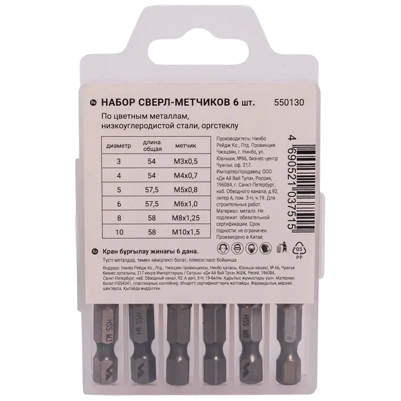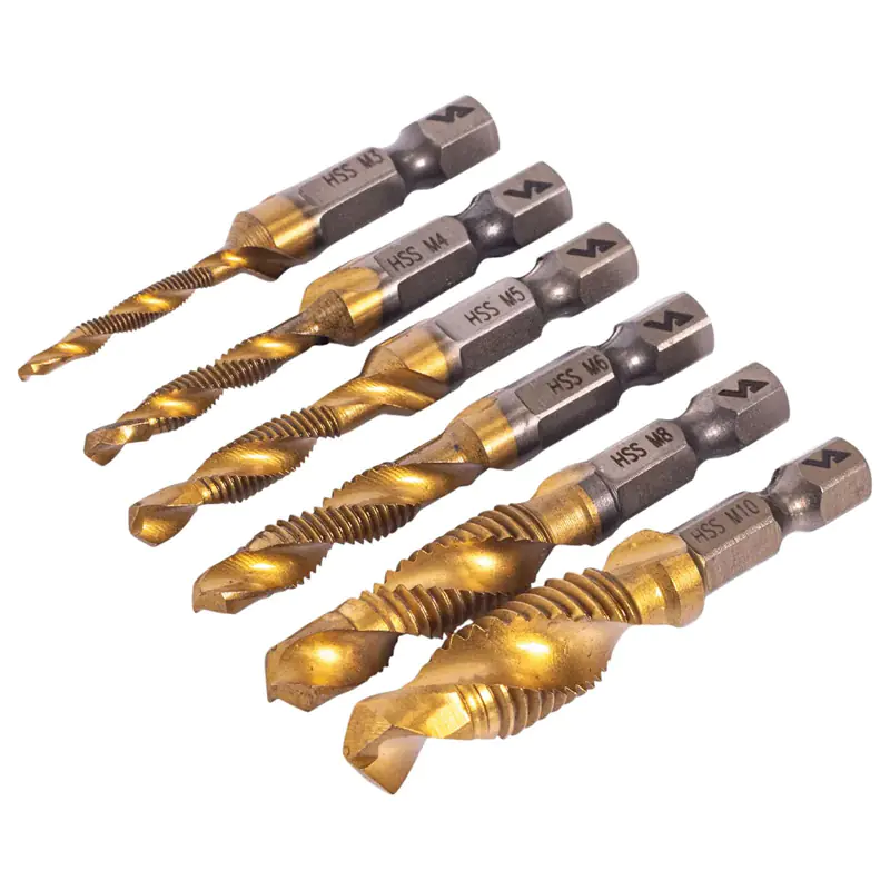 Набор сверл-метчиков предназначен для сверления отверстий и одновременного нарезания резьбы. Сверла изготовлены из высококачественной быстрорежущей стали HSS4241, которая увеличивает износостойкость инструмента. Нитридтитановое покрытие обеспечивает дополнительную износостойкость. В результате увеличивается срок службы и качество работы. А шестигранный хвостовик надёжно фиксируется в патроне инструмента.