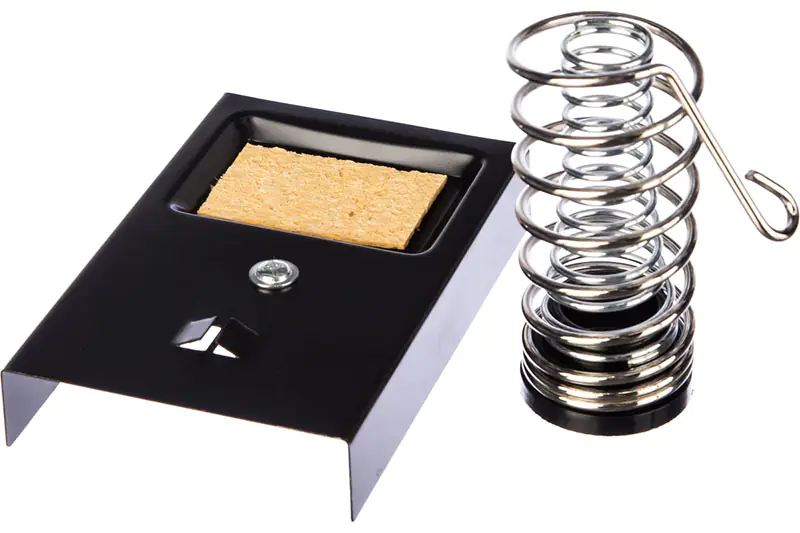 Подставка FD 7049 (ZD-10A) под паяльник предназначена для безопасного хранения паяльника при нагревании, в промежутках между использованием и охлаждении. Выполнена из витой хромированной конусообразной пружины и металлической платформы с ложементом под губку для очистки жала паяльника от остатков припоя. Губка для очистки жала паяльника в комплекте. Паяльник легко и удобно помещается в направляющую.