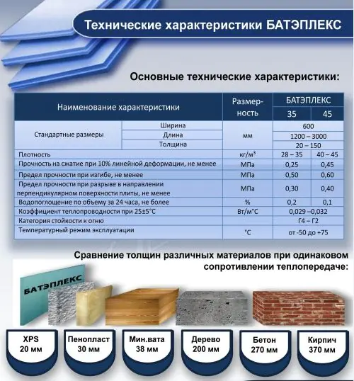 Батэплекс – наш белорусский ответ Пеноплексу, Техноплексу и Урсе. Плюсы у отечественного материала несомненно есть: плотность соответствует заявленной, поверхность способствует лучшему креплению фасадных материалов, да и цена ниже конкурентов. Теплопроводные характеристики близки к аналогам.