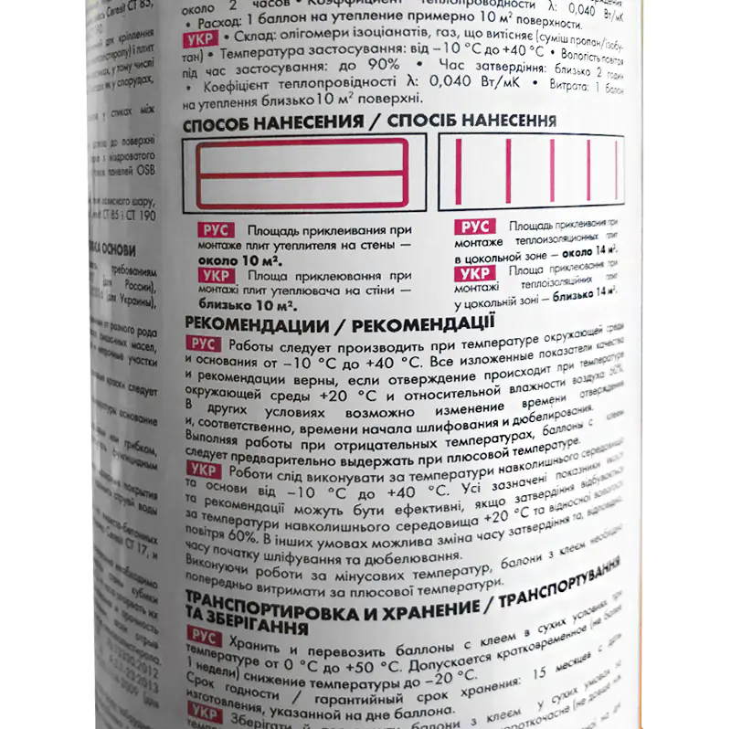 Энергично встряхнуть баллон в течение нескольких секунд, снять с клапана колпачок и навинтить монтажный пистолет на баллон, установленный клапаном вверх. Клапан монтажного пистолета при этом должен быть закрыт! После подсоединения баллона можно открыть клапан монтажного пистолета и приступить к нанесению клея. Монтажный пистолет следует держать баллоном вверх на расстоянии от плиты, достаточном для правильного нанесения клея. Клей наносят на монтажную поверхность плиты по периметру с отступом от краев примерно на 2 см и одной полосой через центр параллельно ее длинным сторонам.