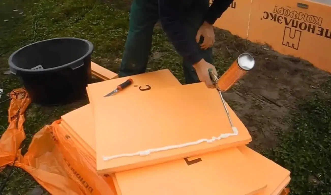 - Наносите Пеноплэкс FASTFIX на теплоизоляционную плиту равномерными полосками параллельно краям (1-2 см от края) и одну полоску – по центральной линии параллельно наиболее длинной стороне.