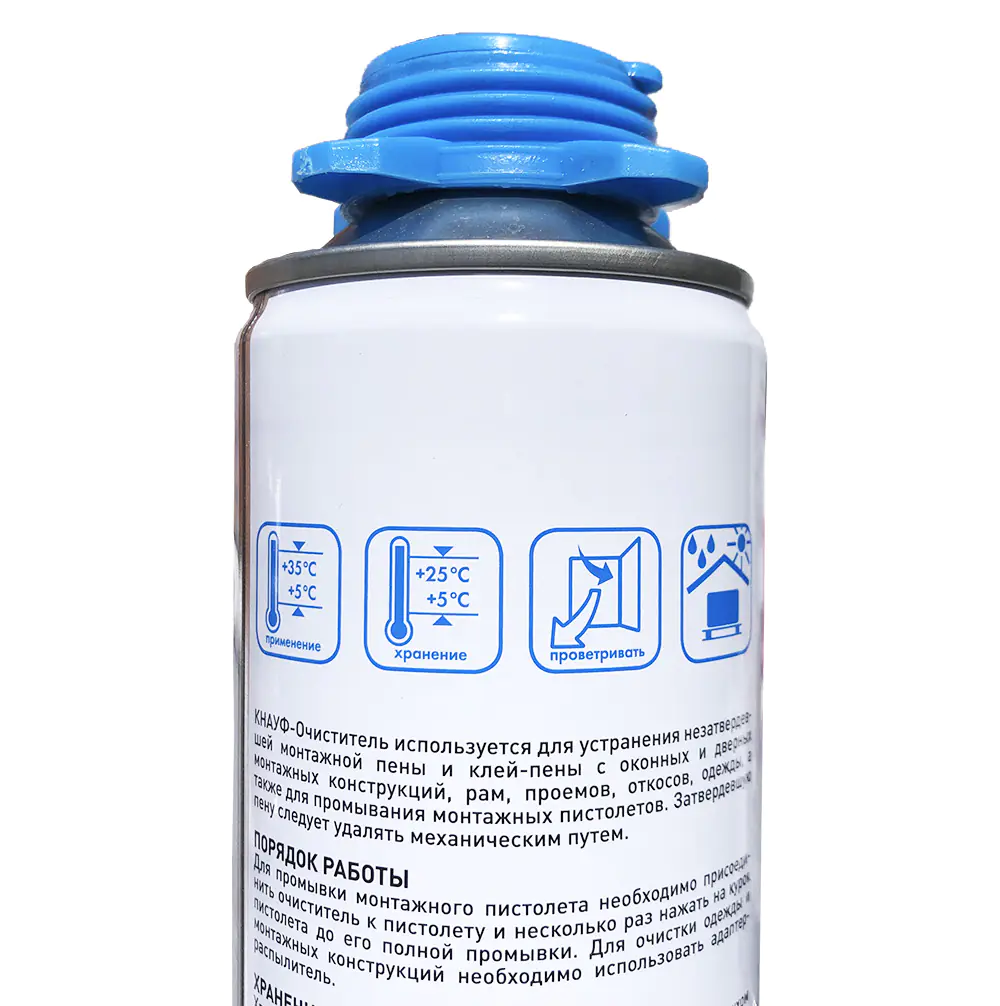 КНАУФ-Очиститель. Композиция на основе органических растворителей, пропан-изобутановая смесь. Применяется для устранения незатвердевшей монтажной пены и клей-пены с оконных и дверных монтажных конструкций, рам, проемов, откосов, одежды, а также для промывания монтажных пистолетов.