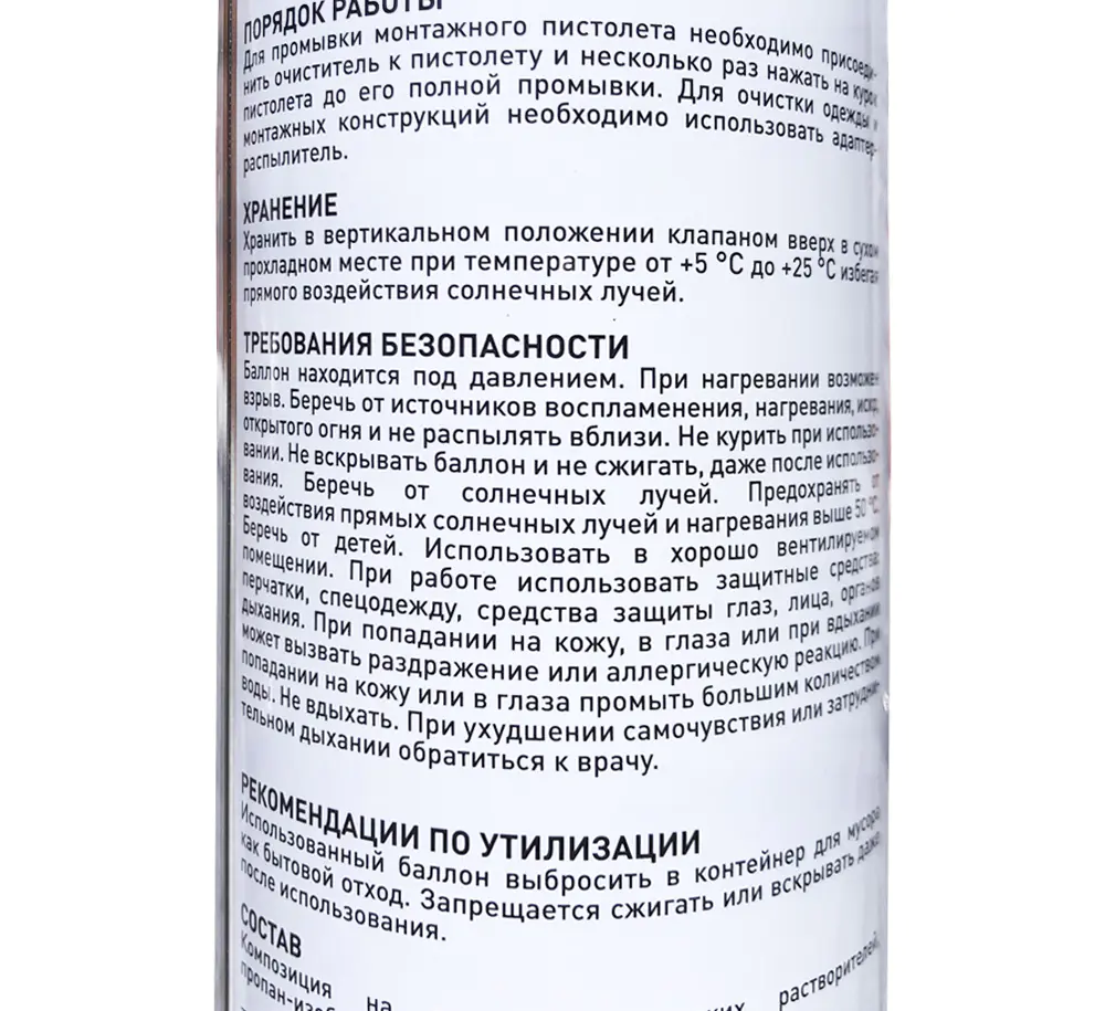 Для промывки монтажного пистолета необходимо присоединить очиститель к пистолету и несколько раз нажать на курок пистолета до его полной промывки. Для очистки одежды и монтажных конструкций необходимо использовать адаптер-распылитель.
