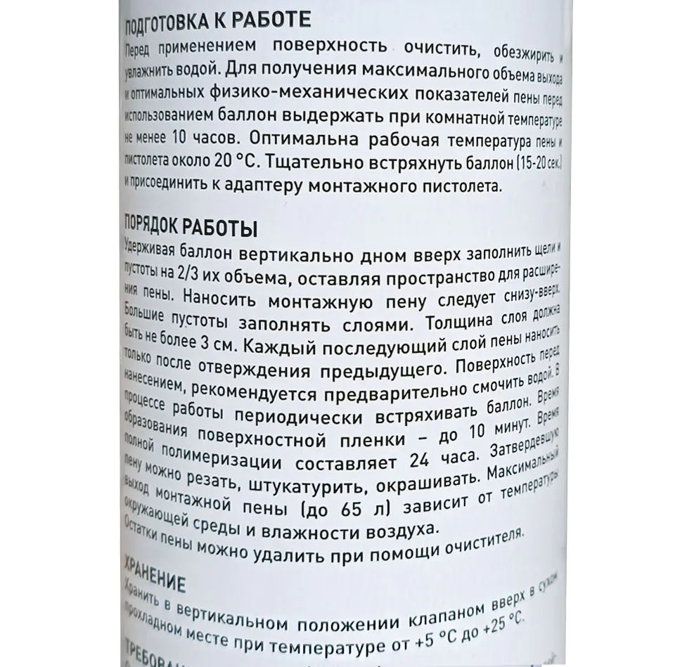 Важно помнить - перевернув баллон в горизонтальное положение и встряхивая его 30-40 секунд, можно увеличить итоговый выход пены на 30%.