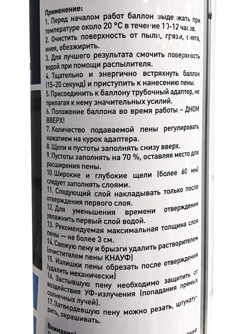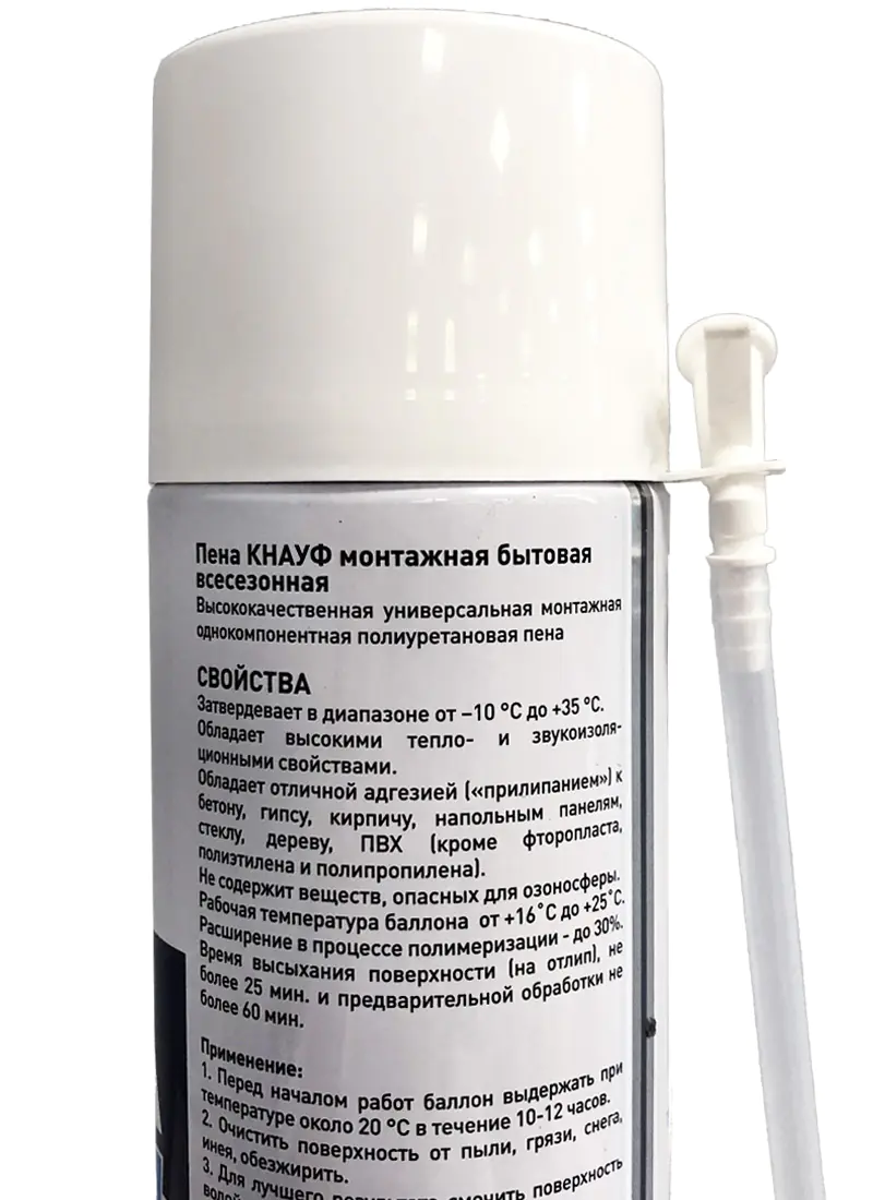 Всесезонная монтажная пена KNAUF применяется для заполнения пустот и щелей, герметизации стыков, повышения тепло-и звукоизоляции, монтажа при проведении локальных "бытовых" работ. Обладает отличной адгезией к бетону, гипсу, кирпичу, напольным панелям, стеклу, дереву, ПВХ (кроме фторопласта, полиэтилена и полипропилена). Срок годности 12 мес.