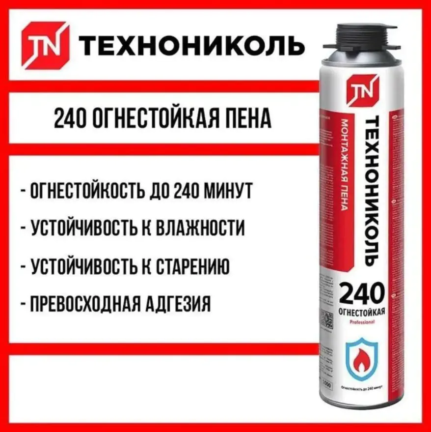 Пена монтажная ТЕХНОНИКОЛЬ 240 PROFESSIONAL огнестойкая – однокомпонентная полиуретановая монтажная пена для заполнения пустот, монтажа оконных и дверных огнезащитных блоков, герметизации швов с целью огне- и дымозащиты. Обладает высокой адгезией к бетону, древесине, пластику, кирпичу, полиуретану и пенополистиролу. Не следует применять с тефлоном и полиэтиленом. Перед использованием обязательно выдержать баллон при комнатной температуре в течение 12 часов.