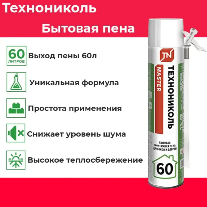 Пена монтажная бытовая ТЕХНОНИКОЛЬ 60 Master c трубкой-аппликатором. Используется для заполнения различных полостей, зазоров, щелей, каналов без использования специального инструмента (пистолета для монтажной пены). После высыхания образует твердый водонепроницаемый пористый материал, который режется и красится. Окраска или другое защитное покрытие для пены необходимы, так как она боится ультрафиолетового излучения. Обладает хорошей адгезией к большинству строительных материалов, за исключением фторопласта, силикона и полиэтилена.