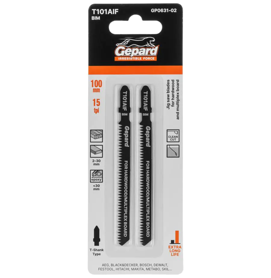 Пилка для электролобзика GEPARD по дереву T101AIF 2 штуки – сменный пильный элемент по дереву для электролобзиков. Используется для распила твердой древесины, ламината, плит с покрытием, стеклопластика толщиной не более 30 мм. Пропил прямой, тонкий, аккуратный и чистый рез.