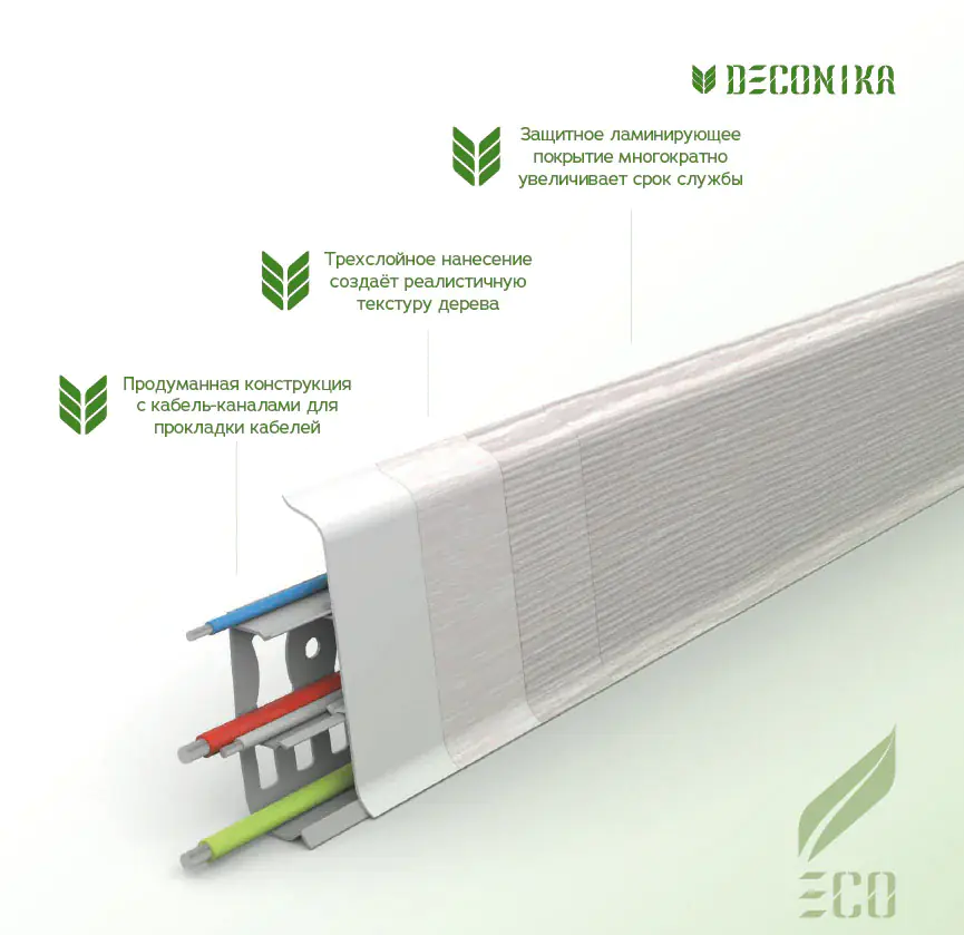 Плинтус напольный Идеал Деконика это продуманный современный дизайн с задним монтажным профилем и цельной лицевой частью. Легкий монтаж за счет формы и перфорации основы плинтуса. Общая коллекция реалистичных декоров плинтусов Идеал с защитным покрытием, продлевающим срок службы. Высота плинтуса по стене - 55 мм.