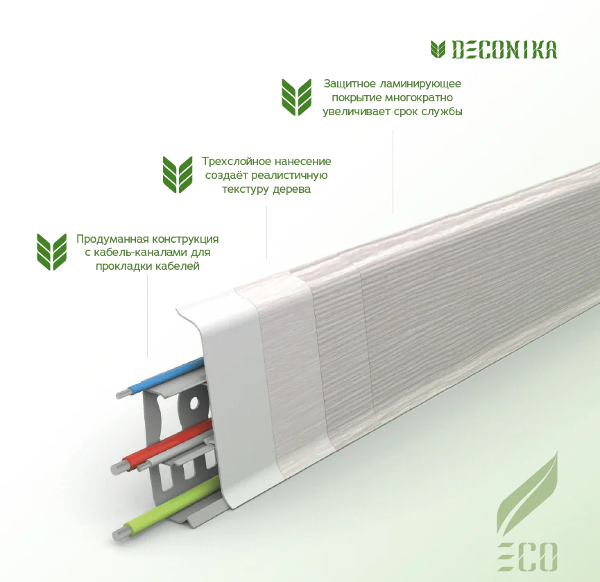 Плинтус напольный Идеал Деконика это продуманный современный дизайн с задним монтажным профилем и цельной лицевой частью. Легкий монтаж за счет формы и перфорации основы плинтуса. Общая коллекция реалистичных декоров плинтусов Идеал с защитным покрытием, продлевающим срок службы.
