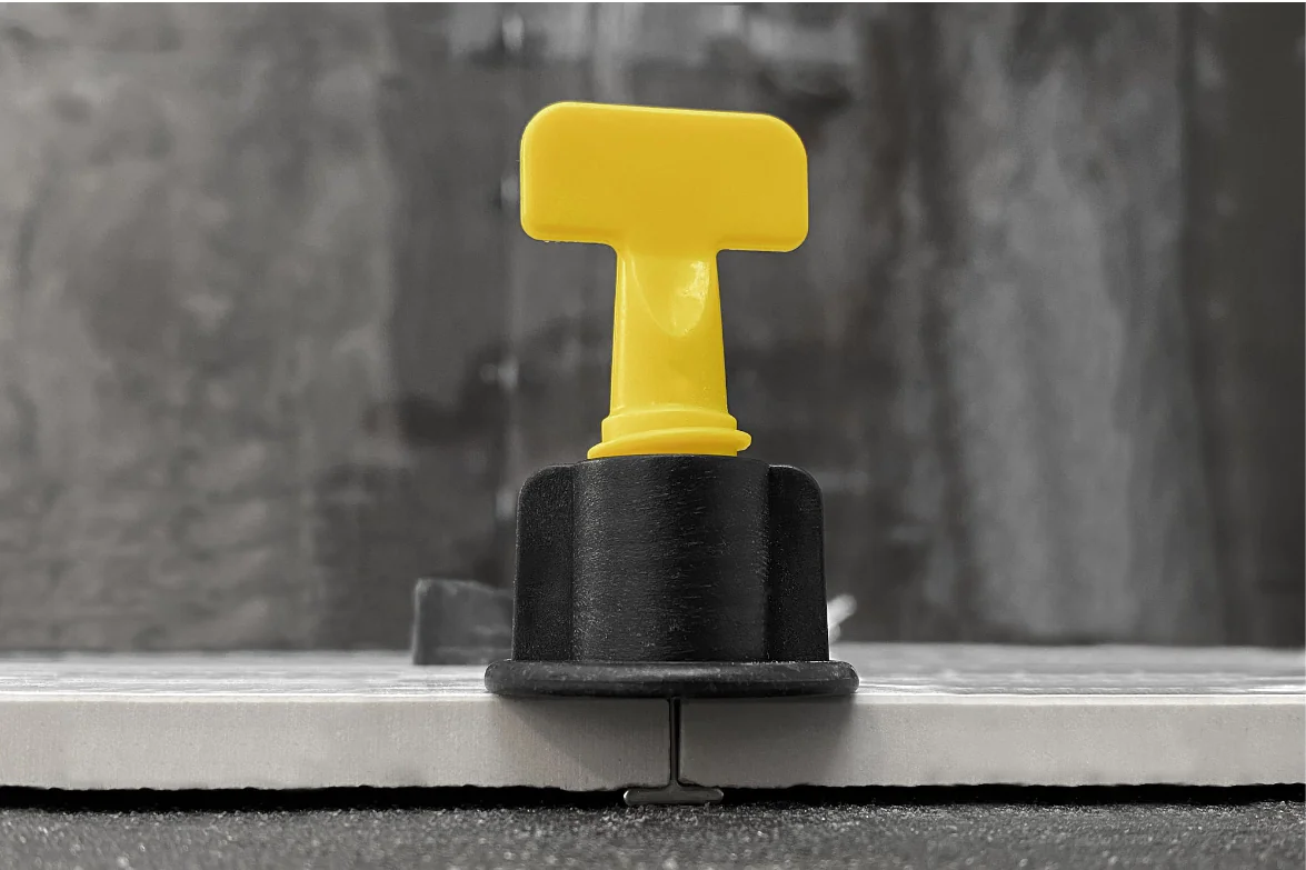 - Вставьте фиксатор между двумя плитками таким образом, чтобы его ножка была параллельна плиткам в зазоре.