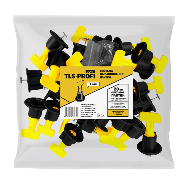 Фиксатор плитки TLS-Profi - дополнительный инструмент для затяжки плитки в плоскости. Используется вместе с системой выравнивания плитки TLS-Profi (для швов от 1 мм) в случае установки недостаточного количества зажимов. Может использоваться многократно. Материал - полипропилен. В упаковке 20 фиксаторов + ключ + 10 игл.