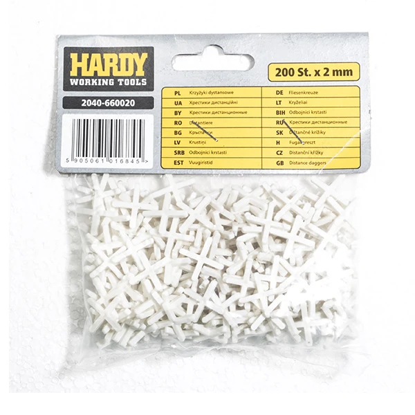 Крестики для укладки плитки Hardy 2 мм (2040-660020) используются для выравнивания швов при укладке керамической плитки или керамогранита. Цвет: белый. Упаковка: 200 шт. Ширина: 2 мм. Материал: пластик.