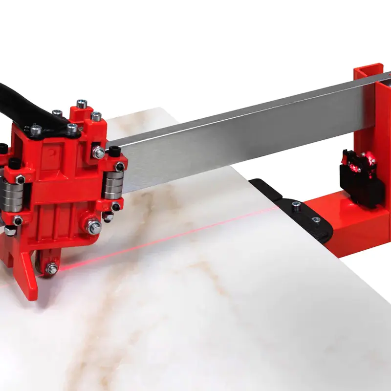 Плиткорез имеет большой прочный рычаг, который позволяет оказывать на заготовку максимальное давление при минимальном усилии. Устройство направляющей каретки плиткореза охватывает монорельс с четырех сторон и передвигается посредством шарикоподшипникового механизма, обеспечивая плавность хода. Рабочий стол изготовлен из стали, что делает станину станка очень прочной. Рабочий стол покрыт мембраной, которая создает амортизирующий эффект при разделении плитки, также это позволяет уменьшить жесткость резки, что особенно важно при работе с хрупкими материалами и керамогранитом с очень высоким внутренним напряжением (перекалённым керамогранитом).