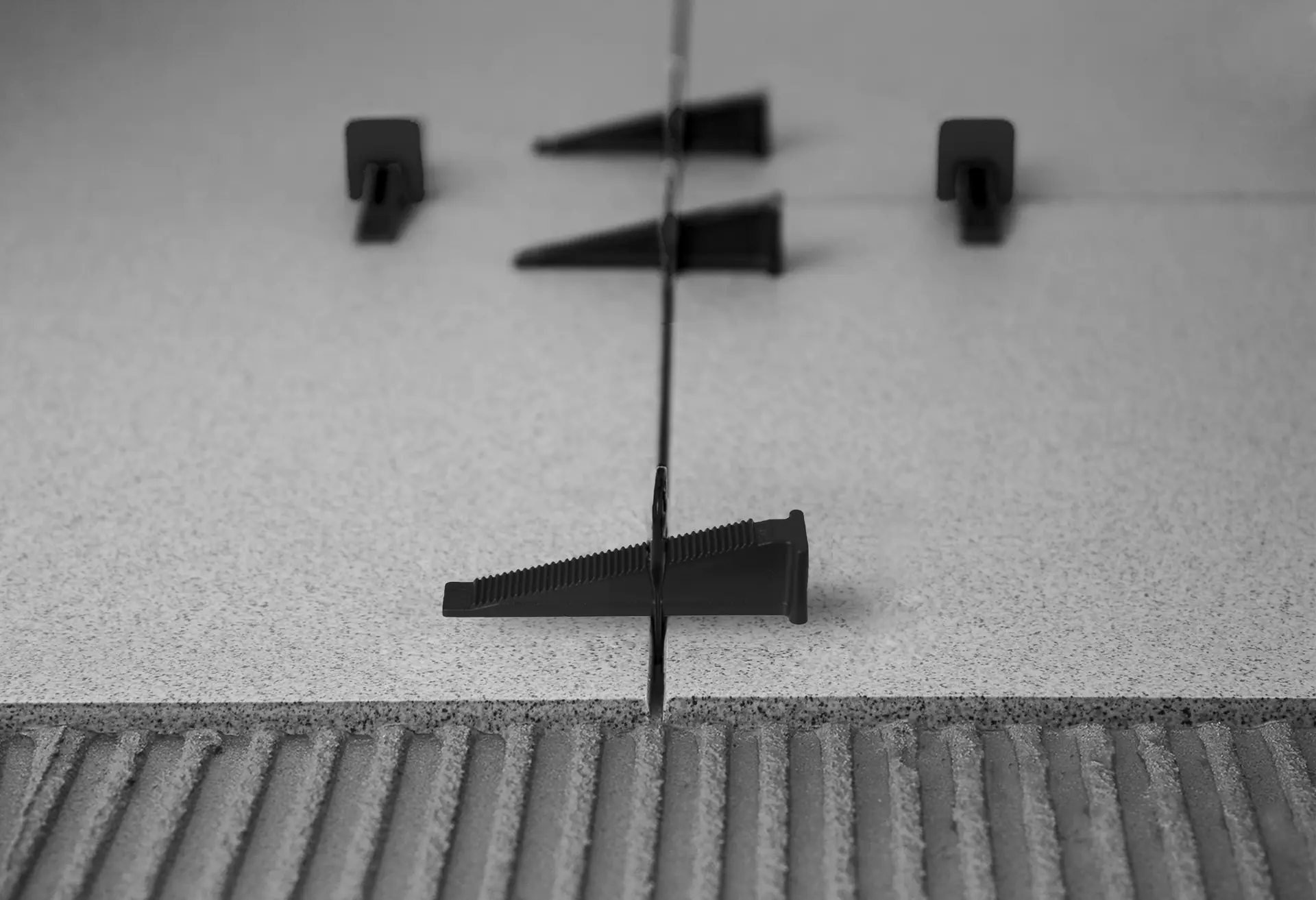 СВП состоит из зажима и клина. Зажим – одноразовая часть системы. После укладки плитки и полного высыхания клеевого состава, его "сбивают" и нижнее основание остаётся под плиткой.
