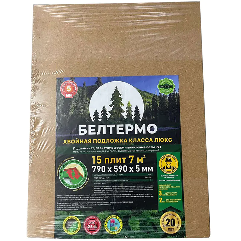 Хвойная подложка под ламинат 5 мм из древесного волокна используется в качестве тепловой и акустической изоляции, а также выравнивающей подложки под финишные напольные покрытия: ламинат, паркет, кварцвинил. Толщина 5 мм, в упаковке 15 листов размером 790 х 590 мм.