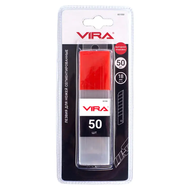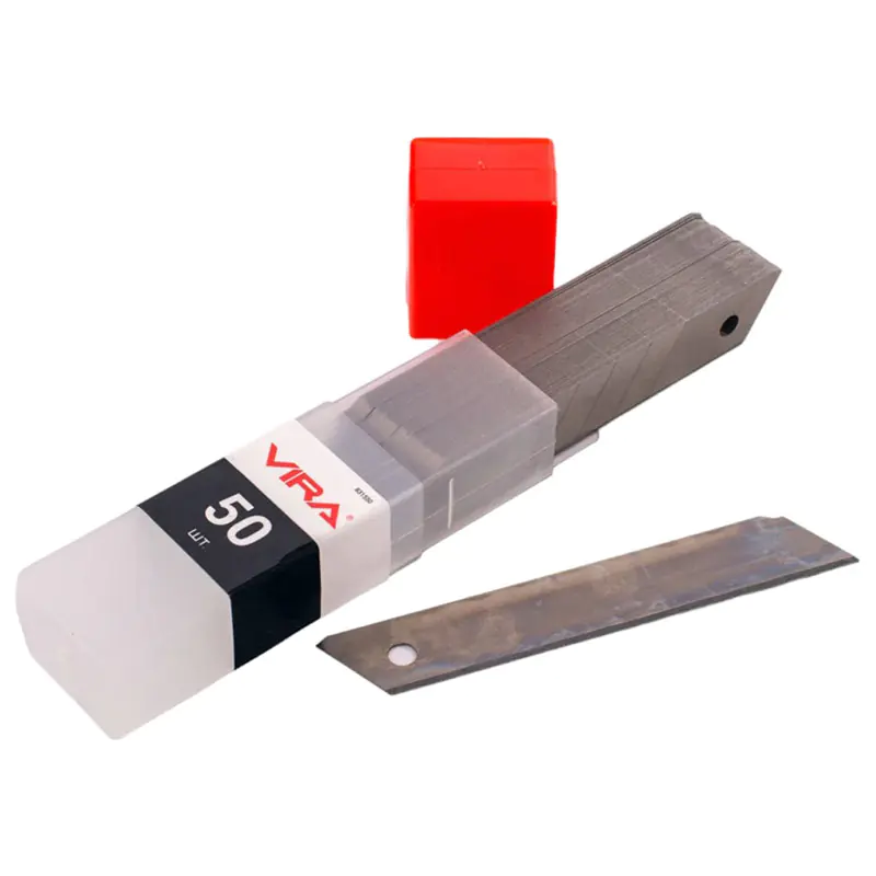 Лезвия для ножей VIRA сегментные 18 мм предназначены для разрезания бумаги, картона, пленки, ткани, резины. Каждое лезвие имеет засечки для надлома затупившегося сегмента. Размер 18х100 мм. Набор включает в себя 50 сегментированных лезвий для ножей в контейнере. Материал: высокоуглеродистая сталь CS.