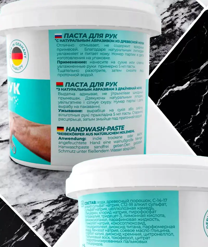 - В качестве абразивных частиц используется отшлифованная древесная мука, мелкие гранулы мягкого абразива пасты для рук помогают удалять глубоко въевшуюся грязь.