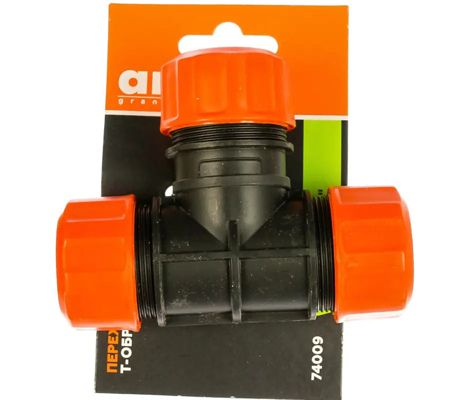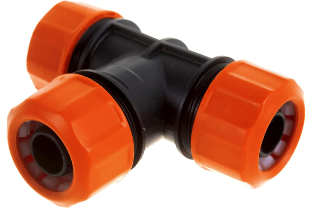 Переходник Т-образный для соединения трех шлангов диаметром 3/4" с цанговым соединением. Выполнен из пластика и не подвержен коррозии.