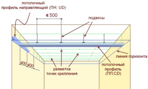 UD профили должны образовать замкнутую рамку. Для потолка используются подвесы.