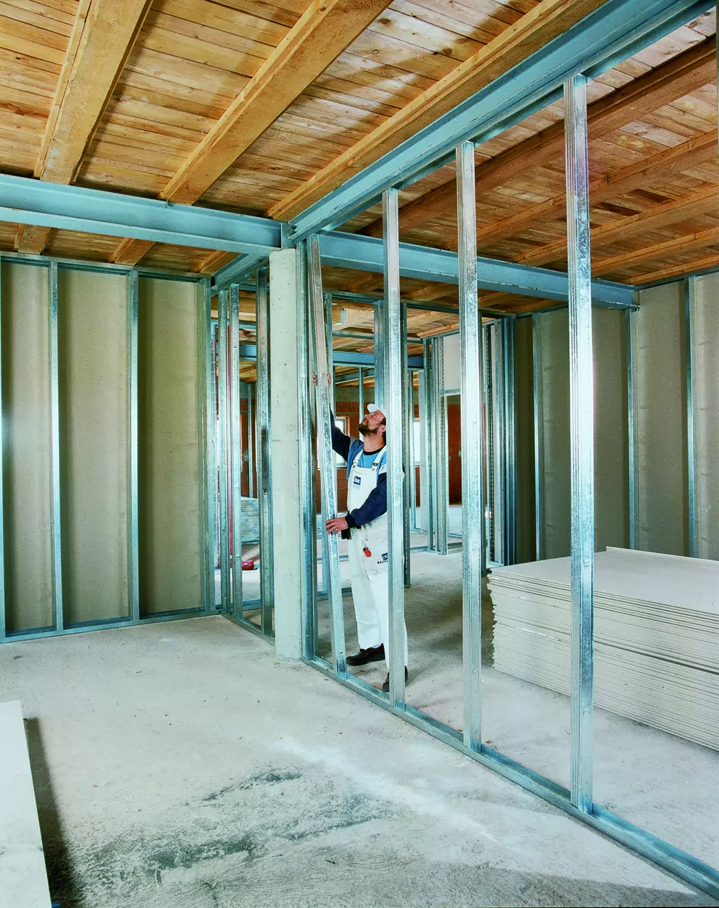 Конструкция профиля UW 100x40 дополняется вертикальными стойками из профиля CW. При монтаже вам также потребуются комплектующие и крепёжные детали.