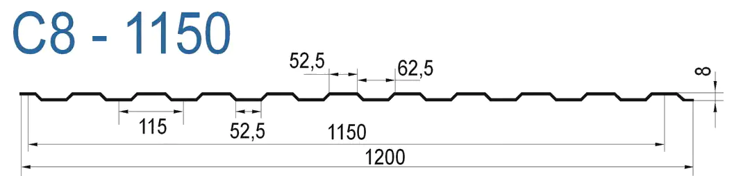 Профлист С8 – это изделие из тонколистовой оцинкованной стали с поверхностью в виде симметричного трапецевидного профиля. Маркировка в названии указывает на высоту профиля в миллиметрах. Подобный профнастил, за счёт большей рабочей ширины, имеет невысокую цену за м2 по сравнению с аналогами и относится к стеновым. Применяется для обшивки стен, в качестве наполнителя для забора, а также для изготовления самонесущих ограждающих конструкций с низкими требованиями к жесткости материала. Изготавливается профнастил марки С8 из рулонной тонколистовой оцинкованной стали методом холодного проката. Формирование гофр происходит при многократном воздействии роликов гибочного станка на ленту металла.