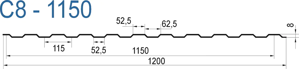 Профлист С8 – это изделие из тонколистовой оцинкованной стали с поверхностью в виде симметричного трапецевидного профиля. Маркировка в названии указывает на высоту профиля в миллиметрах. Подобный профнастил, за счёт большей рабочей ширины, имеет невысокую цену за м2 по сравнению с аналогами и относится к стеновым. Применяется для обшивки стен, в качестве наполнителя для забора, а также для изготовления самонесущих ограждающих конструкций с низкими требованиями к жесткости материала. Изготавливается профнастил марки С8 из рулонной тонколистовой оцинкованной стали методом холодного проката. Формирование гофр происходит при многократном воздействии роликов гибочного станка на ленту металла.