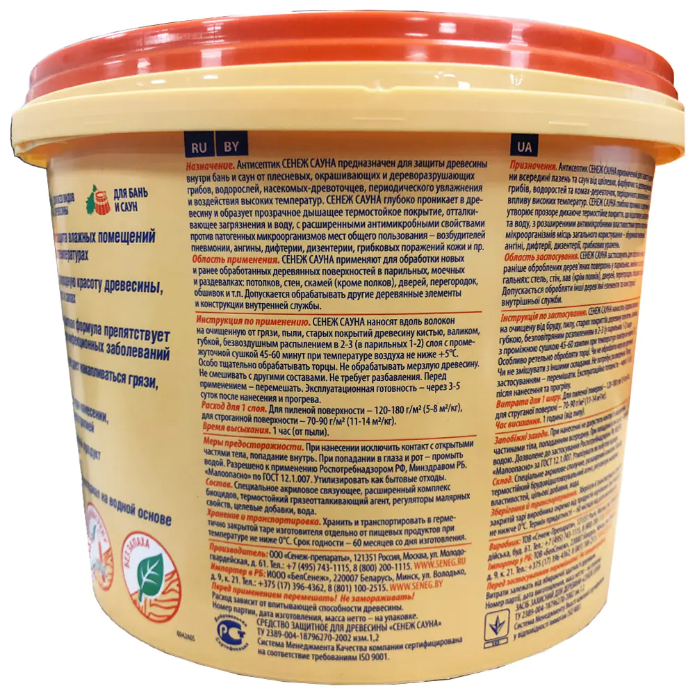 Антисептик Сенеж Сауна наносят вдоль волокон на очищенную от грязи, пыли, старых покрытий древесину кистью, валиком, губкой, безвоздушным распылением в 2-3 (в парильных – в 1-2) слоя с промежуточной сушкой 45-60 минут при температуре воздуха не ниже +50С. Особо тщательно обрабатывать торцы. Не обрабатывать мерзлую древесину. Не смешивать с другими составами. Не требует разбавления. Перед применением – перемешать. Время высыхания на воздушно сухой древесине – 1 час (от пыли). Эксплуатационная готовность – через 3-5 суток после нанесения.