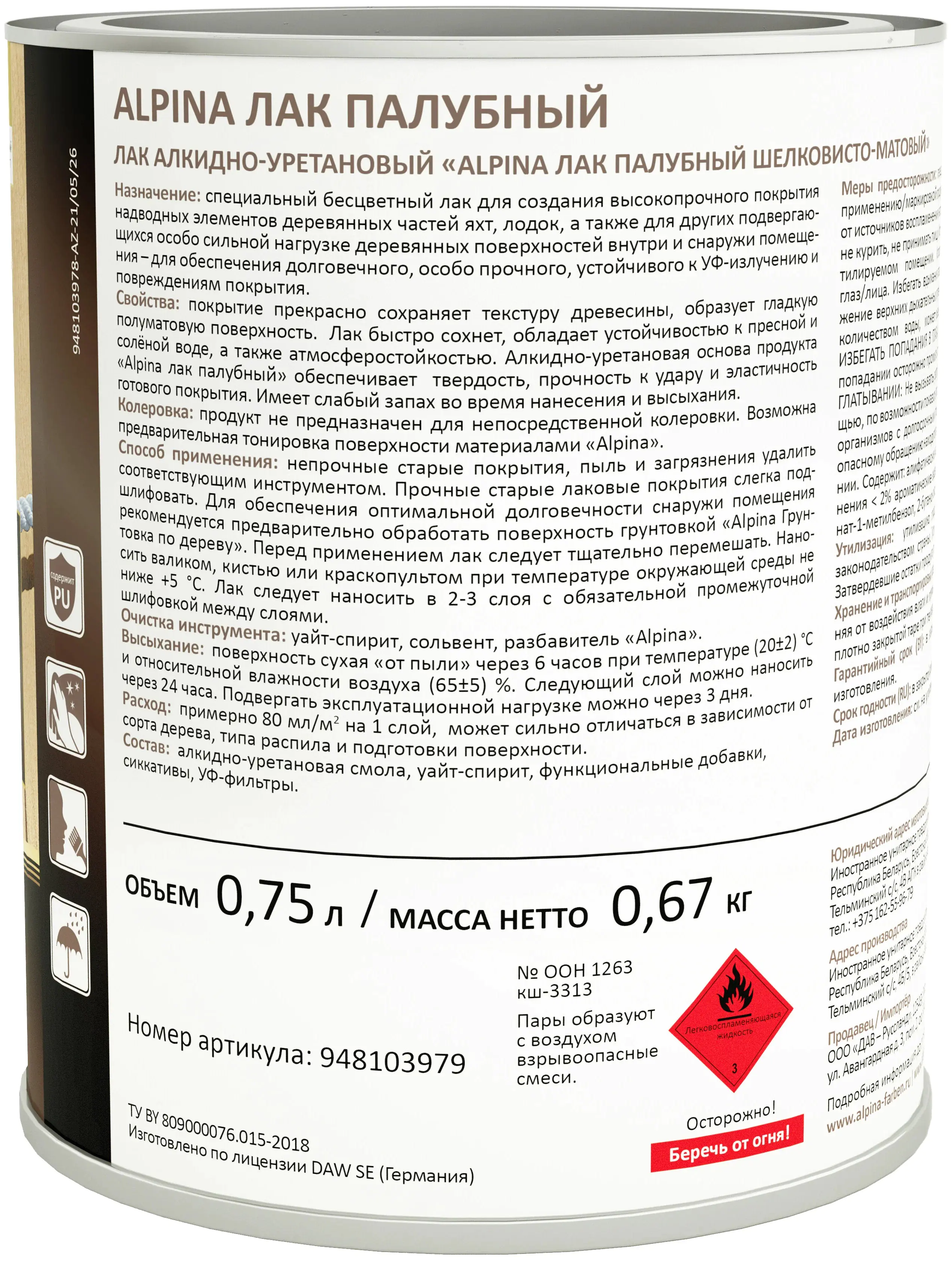 Сохраняет текстуру древесины, образует гладкую и стойкую к истиранию поверхность. Лак быстро сохнет, обладает устойчивостью как к пресной, так и солёной воде, а также высокой устойчивостью к атмосферным факторам (влага, переменная температура, УФ-излучение). Алкидно-уретановая основа обеспечивает твердость, ударную прочность и эластичность готового покрытия. Имеет слабый запах при нанесении и во время высыхания.