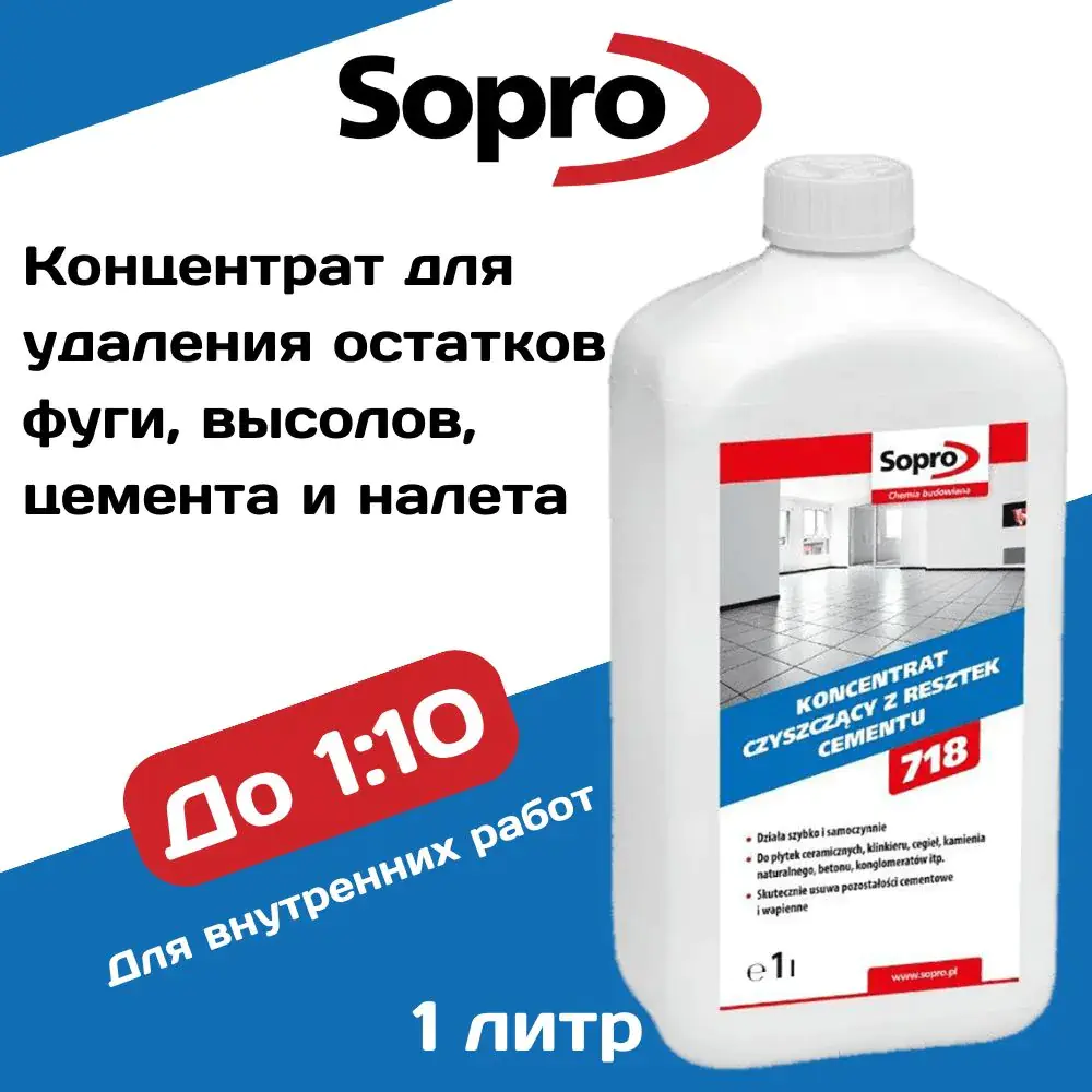 Концентрат Sopro ZSE 718, в зависимости от степени загрязнения облицовки, разбавить водой в пропорции 1:10 и нанести на слегка влажную поверхность. По истечении нескольких минут – смыть препарат большим количеством чистой воды. В случае необходимости применить щётку. При сильном загрязнении применять препарат в виде концентрата или легко разбавленный.
