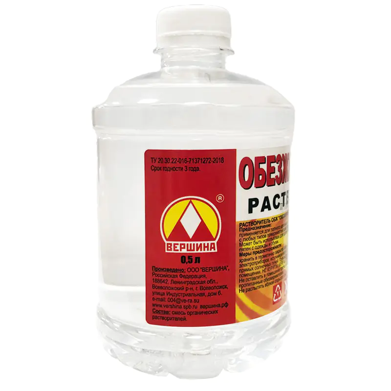Обезжириватель Вершина предназначен для полного удаления всех типов масел и жиров с любых поверхностей перед окрашиванием или склеиванием. Также может быть использован для удаления масляных или битумных пятен с одежды, обуви, с кузова автомобиля.