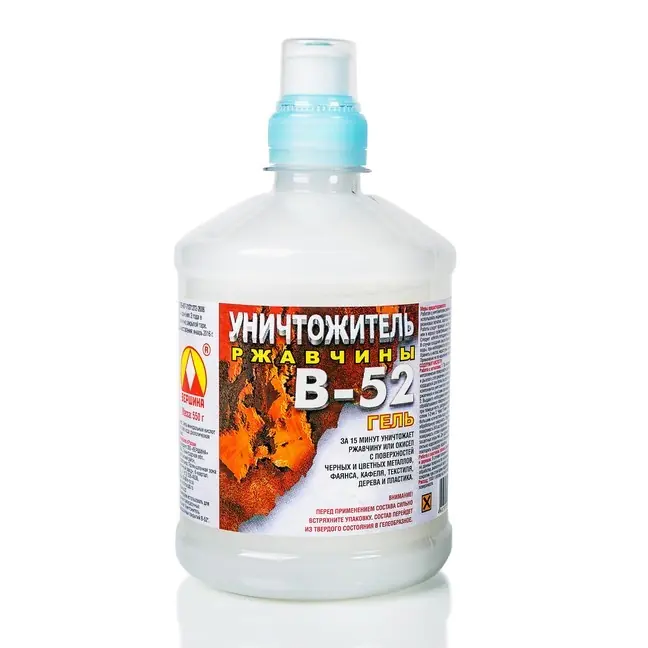 Уничтожитель ржавчины в 52 «Вершина» выпускается в форме геля. Это делает его использование очень удобным, так как вещество не растекается по обрабатываемым плоскостям. Одной банки весом 620 грамм в среднем достаточно для обработки на 5 квадратных метров поверхности.