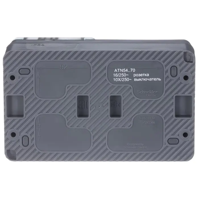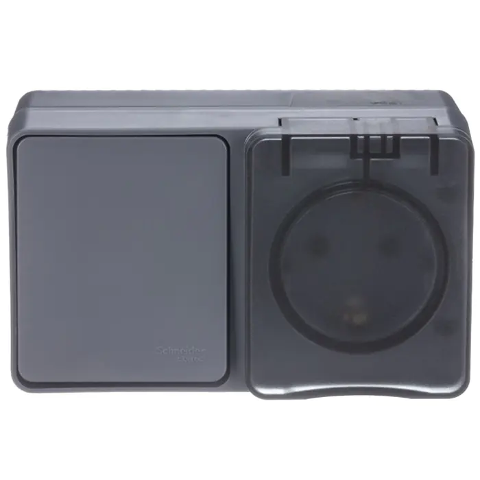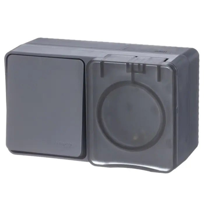 Блок для открытого монтажа из розетки с заземлением со шторками (16А, 250В) и 1-клавишного выключателя (10А) подходит для тех мест, где требуется повышенная защита от влаги и пыли. Цвет антрацит.