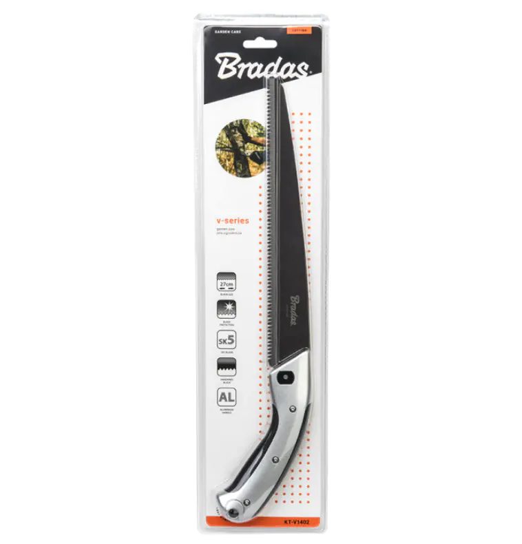 Пила садовая 270 мм BRADAS V-Series Razor KT-V1402 с лезвием с лазерной заточкой, выполненным из японской инструментальной стали SK-5 с защитным тефлоновым покрытием. Алюминиевая ручка с покрытием из мягкого пластика предотвращает выскальзывание из руки при срезе.