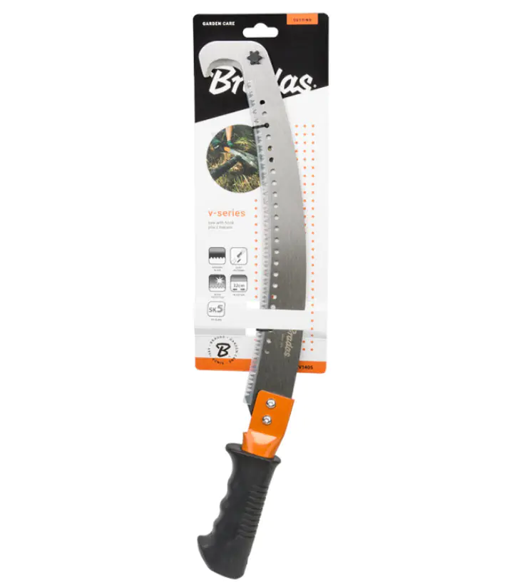 Пила садовая 320 мм BRADAS V-Series KT-V1405 с лезвием с лазерной заточкой, выполненным из японской инструментальной стали SK-5 с защитным тефлоновым покрытием. На конце лезвия крючок, захват для фиксации при срезании. Для облегчения среза полотно пилы имеет изгиб. Можно крепить на ручку.