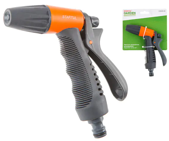Пистолет-распылитель регулируемый STARTUL GARDEN имеет противоскользящее покрытие ручки, фиксирующий курок для длительного полива. Виды струи: прямая, веерная большего диаметра, веерная малого диаметра.