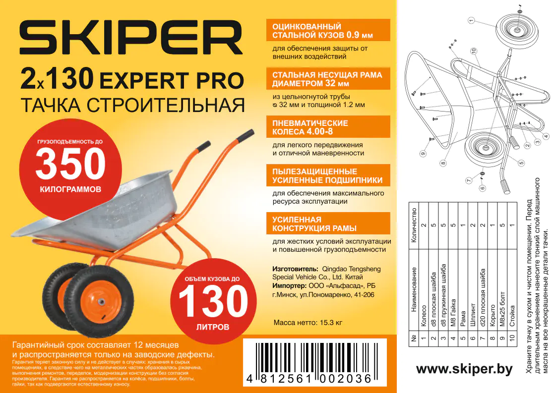 Преимущества тачки строительной Skiper Expert Pro 2х130: