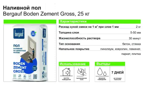 Самонивелир Bergauf Boden Gross используется для устройства прочного и гладкого пола во внутренних помещениях. В его состав входят минеральное вяжущее вещество, несколько фракций песка, полимерные модифицирующие добавки. Благодаря у пола отличные тепло и звукоизолирующие характеристики. Легкое растекание и отсутствие усадки особенно ценны при укладке теплого пола. Наносится вручную или специальной машиной. В поддоне 56 шт.