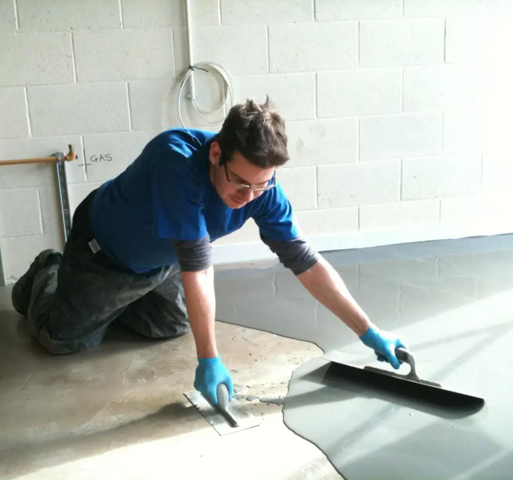 Раствор выливается вручную на подготовленное основание (работу следует начинать от наиболее удаленной от входа стены). Вылитую массу равномерно распределяют по поверхности при помощи ракли с металлическим основанием или шпателя, контролируя толщину слоя. Для удаления пузырьков воздуха раствор прокатать игольчатым валиком в двух перпендикулярных направлениях. Работы по выравниванию отдельного помещения должны проводиться без перерывов. При устройстве самонивелира необходимо повторить температурно-усадочные швы, имеющиеся в основании. В случае заливки на существующий самонивелир или мозаичные полы основание необходимо профрезеровать. При заливке в несколько слоев необходимо фрезеровать каждый предыдущий слой.