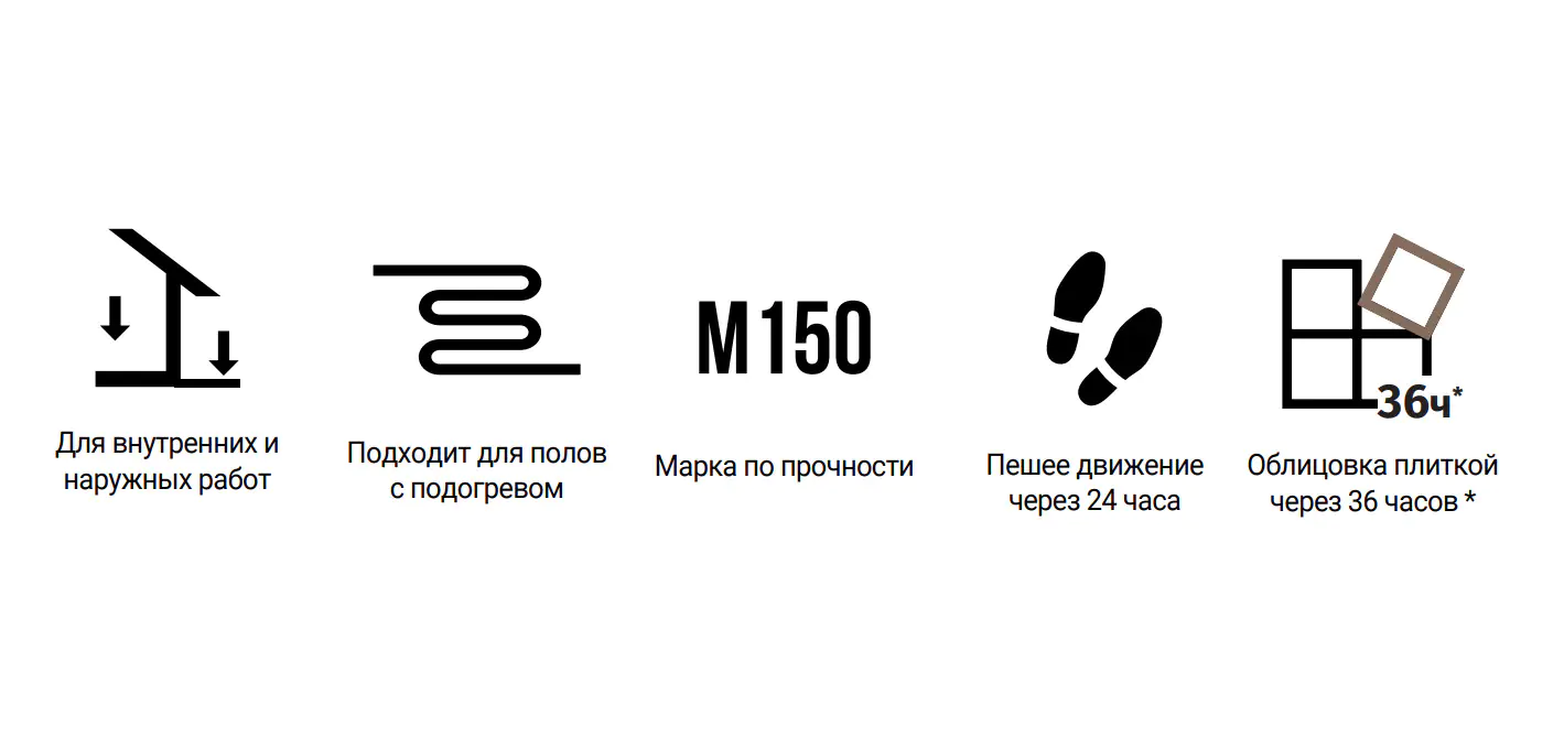 Для устройства цементной стяжки с целью выравнивания и придания необходимого уклона основанию. Рекомендуется использовать в жилых помещениях, зданиях общественного назначения с последующей отделкой керамической плиткой, плиткой из натурального камня, паркетом и др. либо как финишный слой.