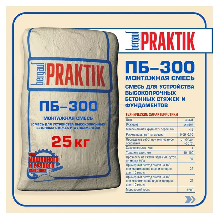 Пескобетон Bergauf М-300 предназначен для устройства полов с высокой нагрузкой внутри помещений так и с наружи. Для укладки несущего слоя, изготовления отмосток, стяжек, изготовления лестниц, при оборудовании и заливке фундаментов, а также при заделывании швов и крепления ЖБИ. Для машинного и ручного нанесения. В поддоне 56 шт.