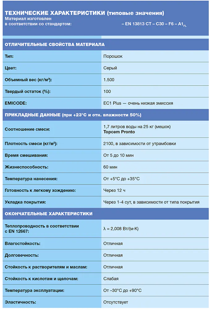 Topcem Pronto характеризуется высокой теплопроводностью (λ = 2 Вт/мК), что делает его особенно подходящим для укладки полов с подогревом.