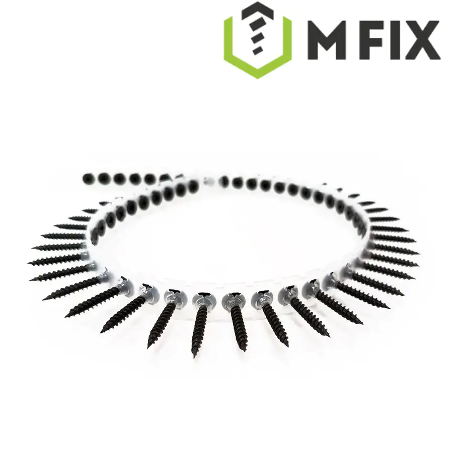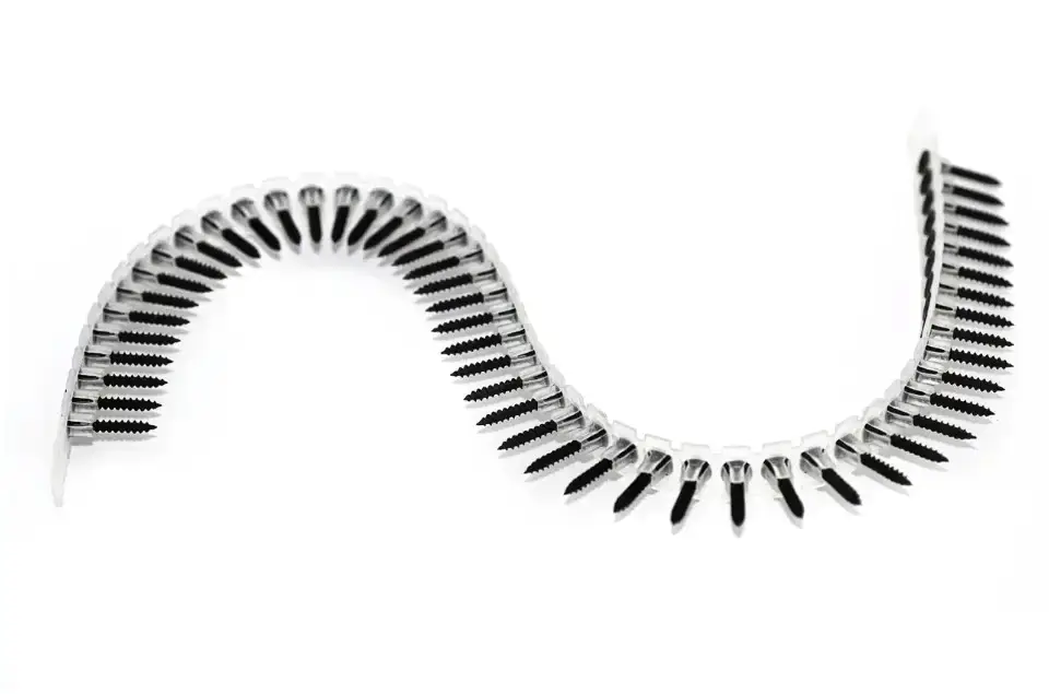 Главная характеристика данного крепежа — это наличие специальной полимерной ленты «обоймы», в которой держатся саморезы разной длинны, толщины или шага резьбы. Используются ленты с саморезами исключительно со специальными "ленточными шуруповертами".