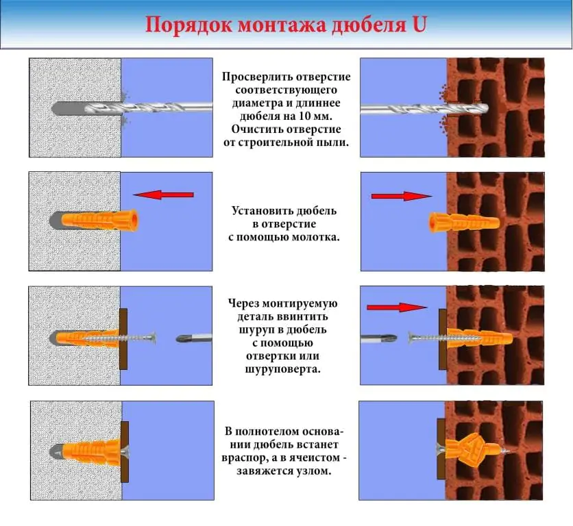 Универсальный дюбель из полипропилена с повышенной эластичностью предназначен для использо­вания его как в сплошном основании, так и в полост­ной кладке (полые бетонные блоки, кирпич с отверсти­ями и так далее). В плотной кладке дюбель ведет себя как обычный трехлепестковый дюбель и обладает всеми его преимуществами. При попадании в полость дюбель наворачивается на шуруп и завязывается в плотный узел, который надежно крепит шуруп в стене.