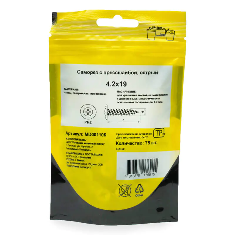 Саморез с прессшайбой 4,2x19 (75 шт) острый предназначен для надежного крепления стальных и других листовых материалов к металлическим (до 0,9 мм) и деревянным конструкциям. Он обеспечивает прочное соединение и удобство монтажа.