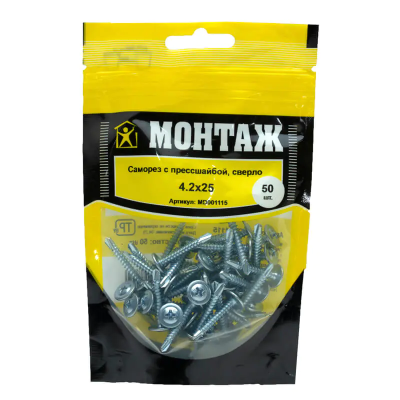 Саморез с прессшайбой 4,2x25 (50 шт) со сверлом предназначен для надежного крепления стальных и других листовых материалов к металлическим (до 2 мм) и деревянным конструкциям. Он обеспечивает прочное соединение и удобство монтажа.