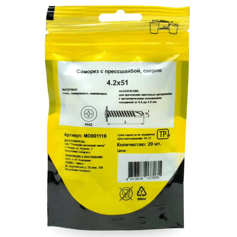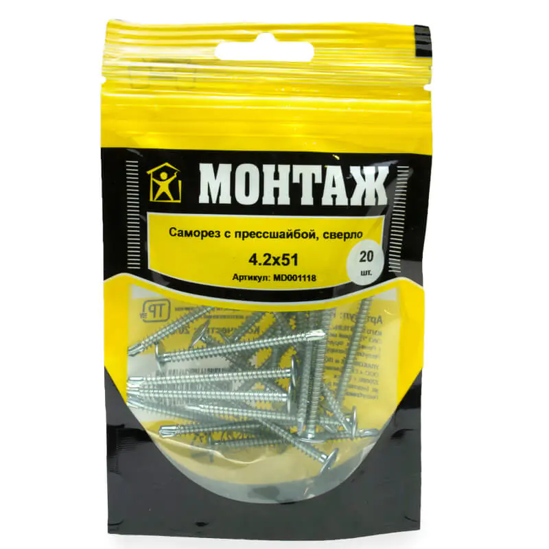 Саморез с прессшайбой 4,2x51 (20 шт) со сверлом предназначен для надежного крепления стальных и других листовых материалов к металлическим (до 2 мм) и деревянным конструкциям. Он обеспечивает прочное соединение и удобство монтажа.